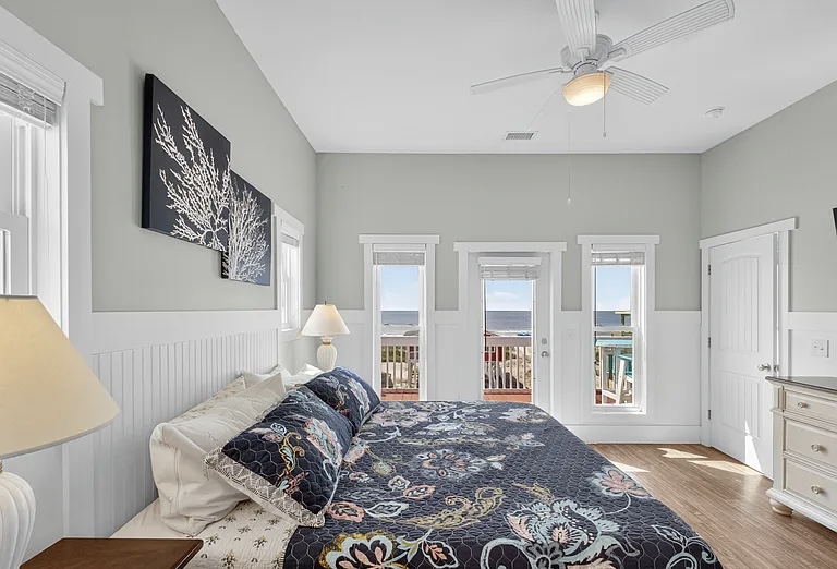 On the top level, unwind in the master en-suite Bedroom #1, which features a king-size bed, private bathroom with a double vanity, standalone shower. Enjoy your morning coffee on the front porch balcony while soaking in picturesque ocean views.