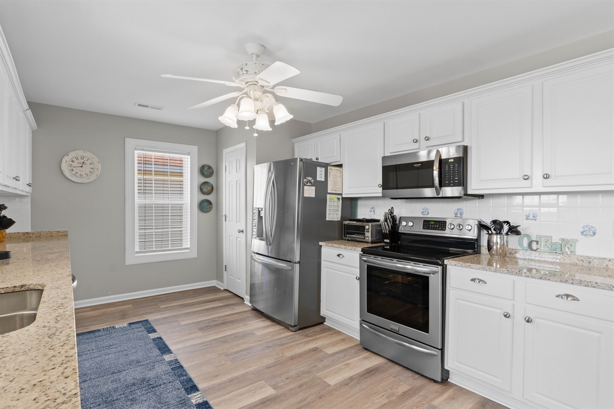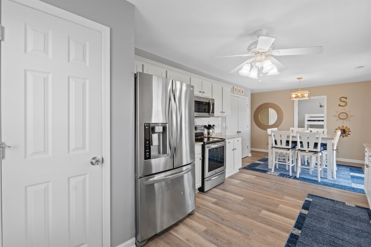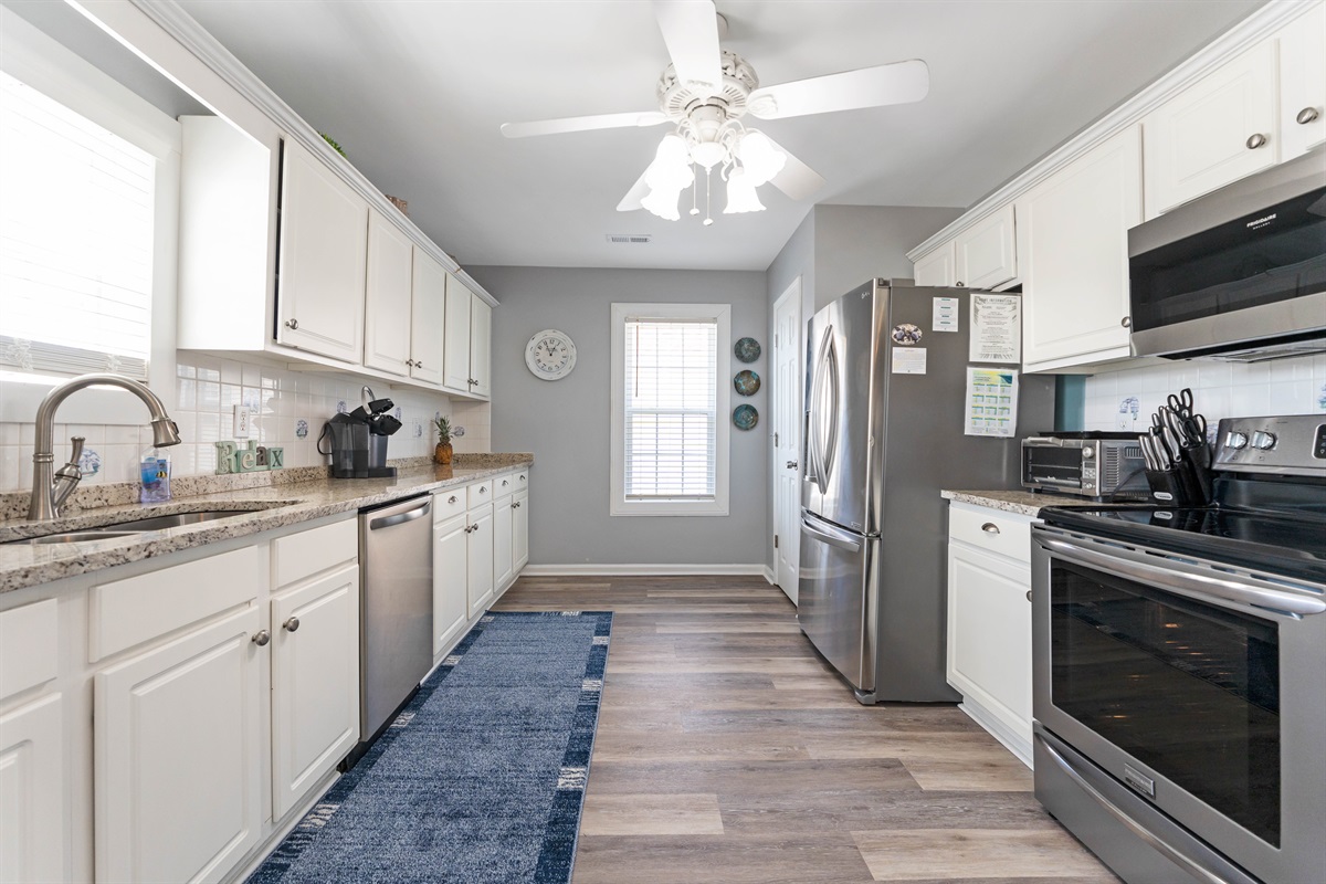 The fully equipped kitchen boasts modern stainless-steel appliances and comes with everything needed for delightful home-cooked meals. Enjoy your morning coffee with ease using our Keurig coffee maker, and take advantage of our array of cookware, utensils, and convenient amenities including a blender, toaster, ice maker, and crock pot. We also provide a selection of K-cups, teas, creamer, and sugar to ensure your stay is as comfortable as possible.