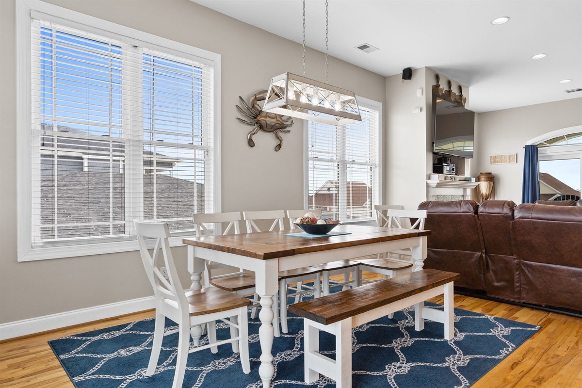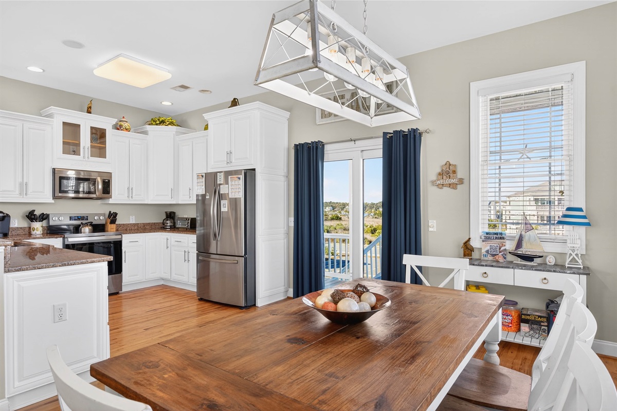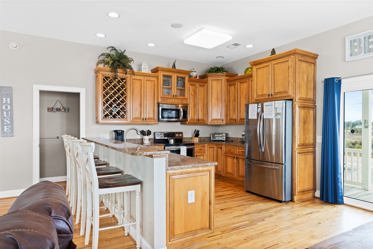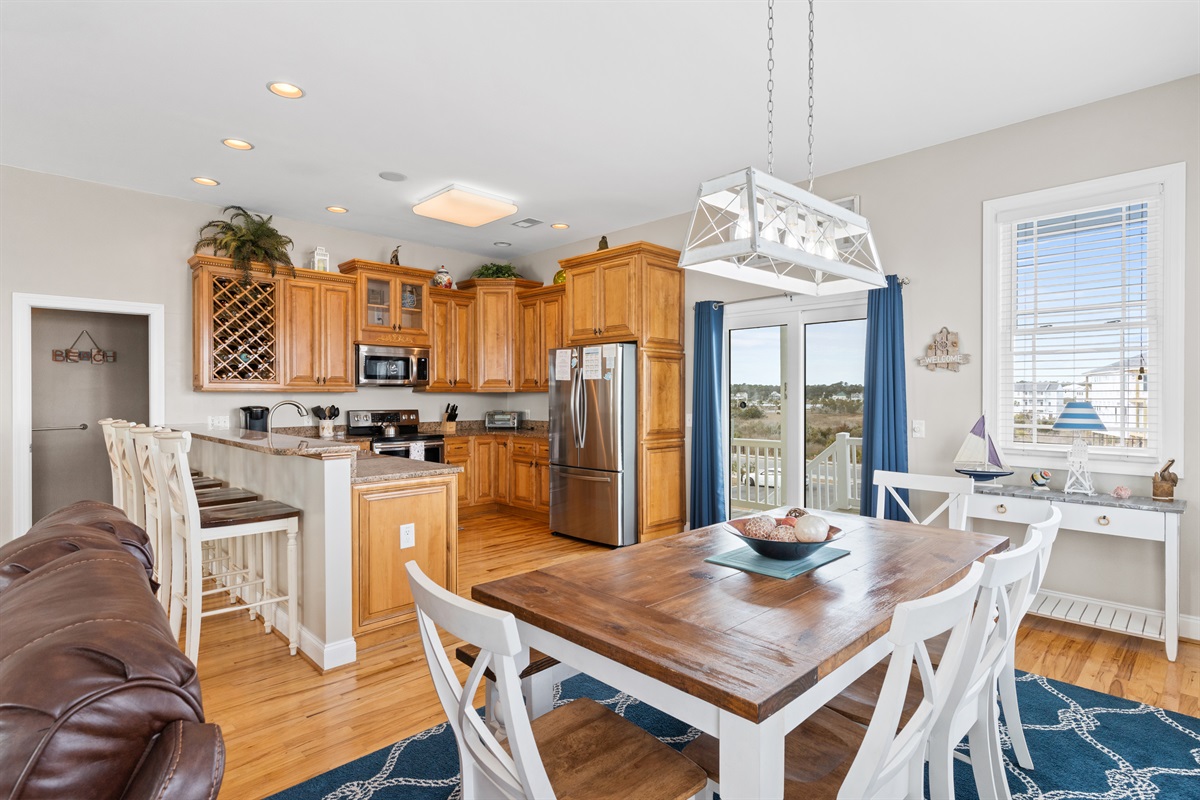 The fully equipped kitchen boasts new stainless-steel appliances and comes with everything needed for delightful home-cooked meals. Enjoy your morning coffee with ease using our Keurig coffee maker, and take advantage of our array of cookware, utensils, and convenient amenities including a blender, toaster, ice maker, and crock pot. We also provide a selection of K-cups, teas, creamer, and sugar to ensure your stay is as comfortable as possible. Dine in style at the generous dining room table that seats eight or gather around the bar seating for four in this open-concept space, perfect for creating lasting memories with loved ones.