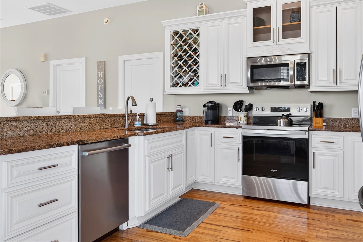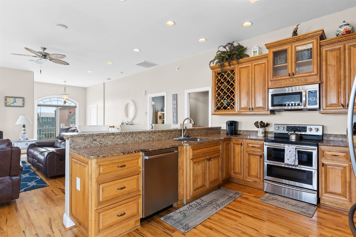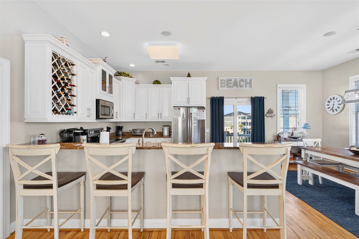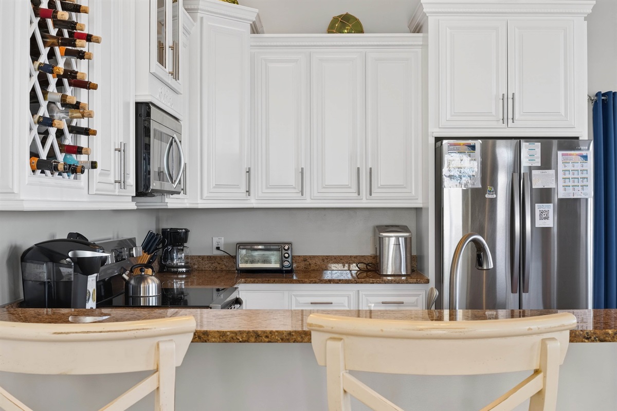 The fully equipped kitchen boasts new stainless-steel appliances and comes with everything needed for delightful home-cooked meals. Enjoy your morning coffee with ease using our Keurig coffee maker, and take advantage of our array of cookware, utensils, and convenient amenities including a blender, toaster, ice maker, and crock pot. We also provide a selection of K-cups, teas, creamer, and sugar to ensure your stay is as comfortable as possible. Dine in style at the generous dining room table that seats eight or gather around the bar seating for four in this open-concept space, perfect for creating lasting memories with loved ones.